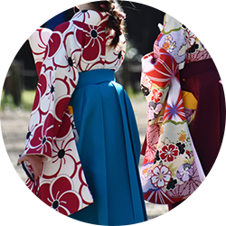 二尺袖もしくは振袖の上から着付ける袴。卒業式で、学生、先生が着用します。